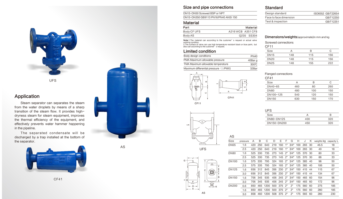 汽水分離器為壓力容器結(jié)構(gòu)碳鋼或不銹鋼設(shè)備,須安裝于水平管線上,排水口垂直向下,所有口徑的汽水分離器均帶安裝支架,以減小管道承載。為確保被分離的液體迅速排放,應(yīng)在分離器底部的排水口連接合適的一套疏水閥組合。 汽水分離器用于蒸汽、壓縮空氣及其它氣體系統(tǒng)可除去蒸汽、空氣或氣體等系統(tǒng)中所含水分。本類閥門在管道中一般應(yīng)當水平安裝