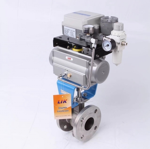 2.調節型氣動球閥的閥芯為V型球芯,采用固定式結構,球芯上帶有V型切口,在執行器上加裝定位器可實現對含纖維、顆粒狀介質比例調節。