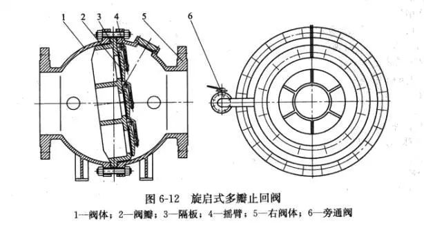 03多瓣式對于大口徑止回閥,如果采用單瓣式結構,當介質反向流動時,必然會產生相當大的水力沖擊,甚至造成閥瓣和閥座密封面的損壞,因而采用多瓣式(圖6-12)結構。它的啟閉件是由許多個小直徑的閥瓣組成的,當介質停止流動或倒流時,這些小閥瓣不會同時關閉,大大減弱了水力沖擊。由于小直徑的閥瓣本身重量輕,關閉動作也比較平穩,閥瓣對閥座的撞擊力較小,不會造成密封面的損壞。多瓣式適用于公稱尺寸DN600以上的止回閥。較大口徑的旋啟式止回閥可帶有旁通閥。