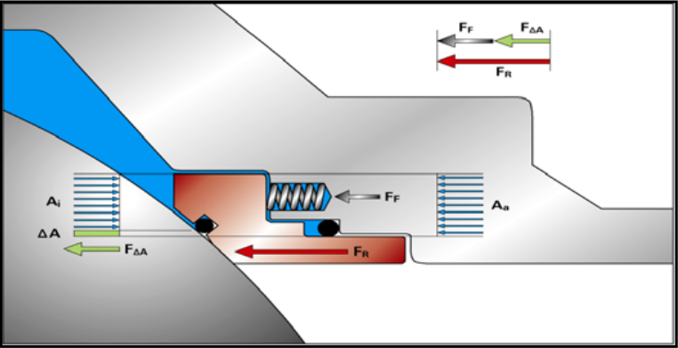 附圖 2.1 Double Piston Effect (DPE)結(jié)構(gòu)及密封原理示意圖(干線壓力對(duì)閥座作用力)